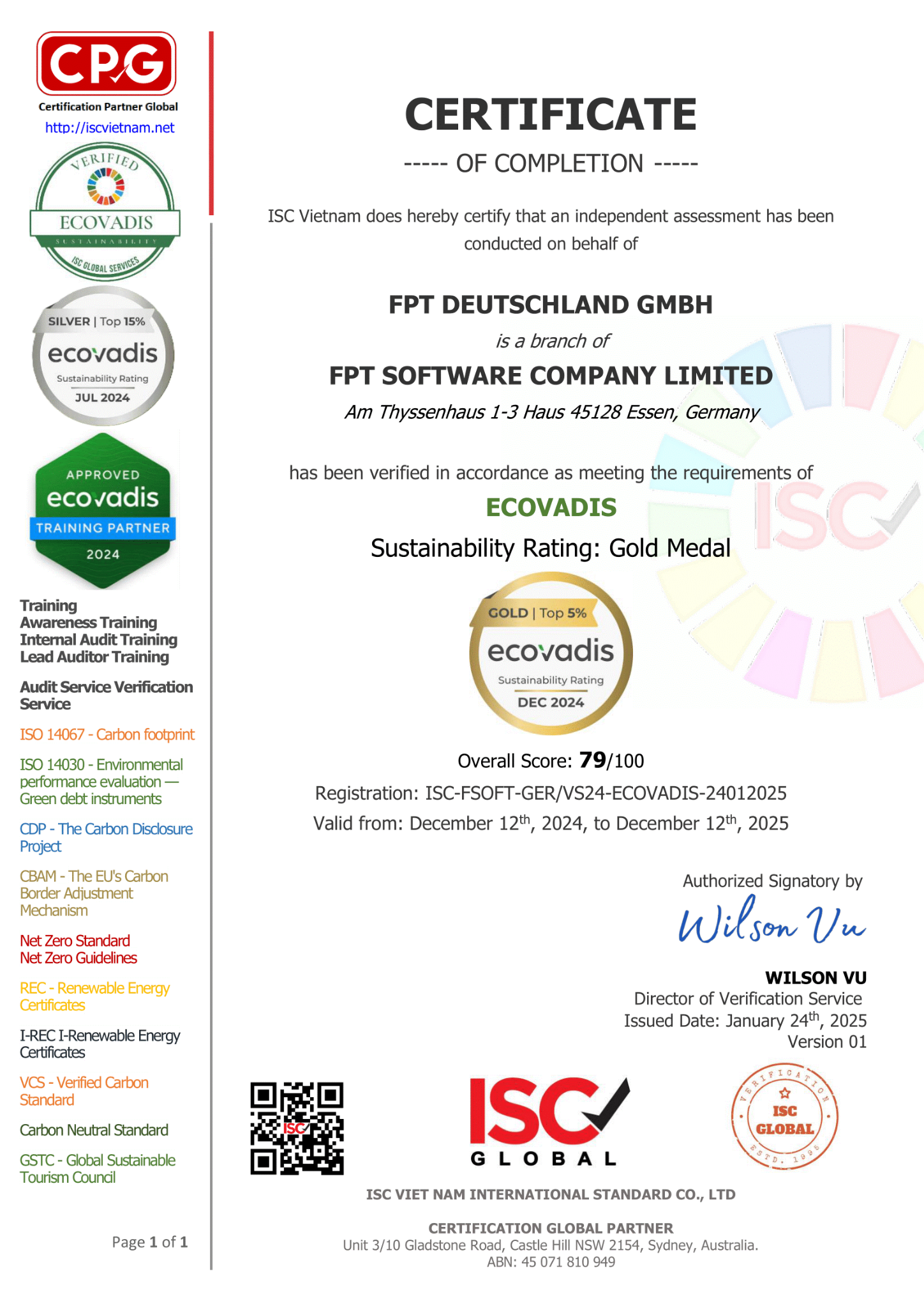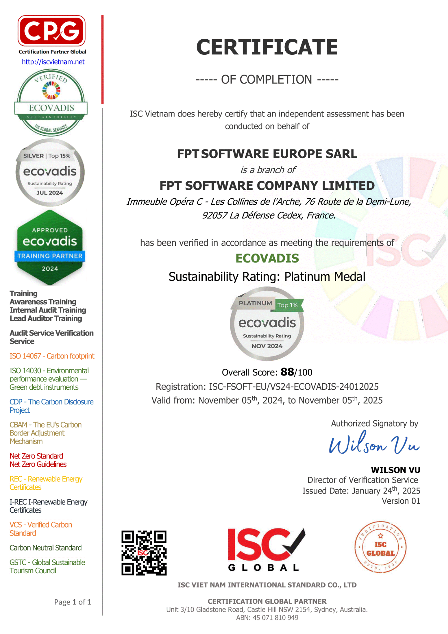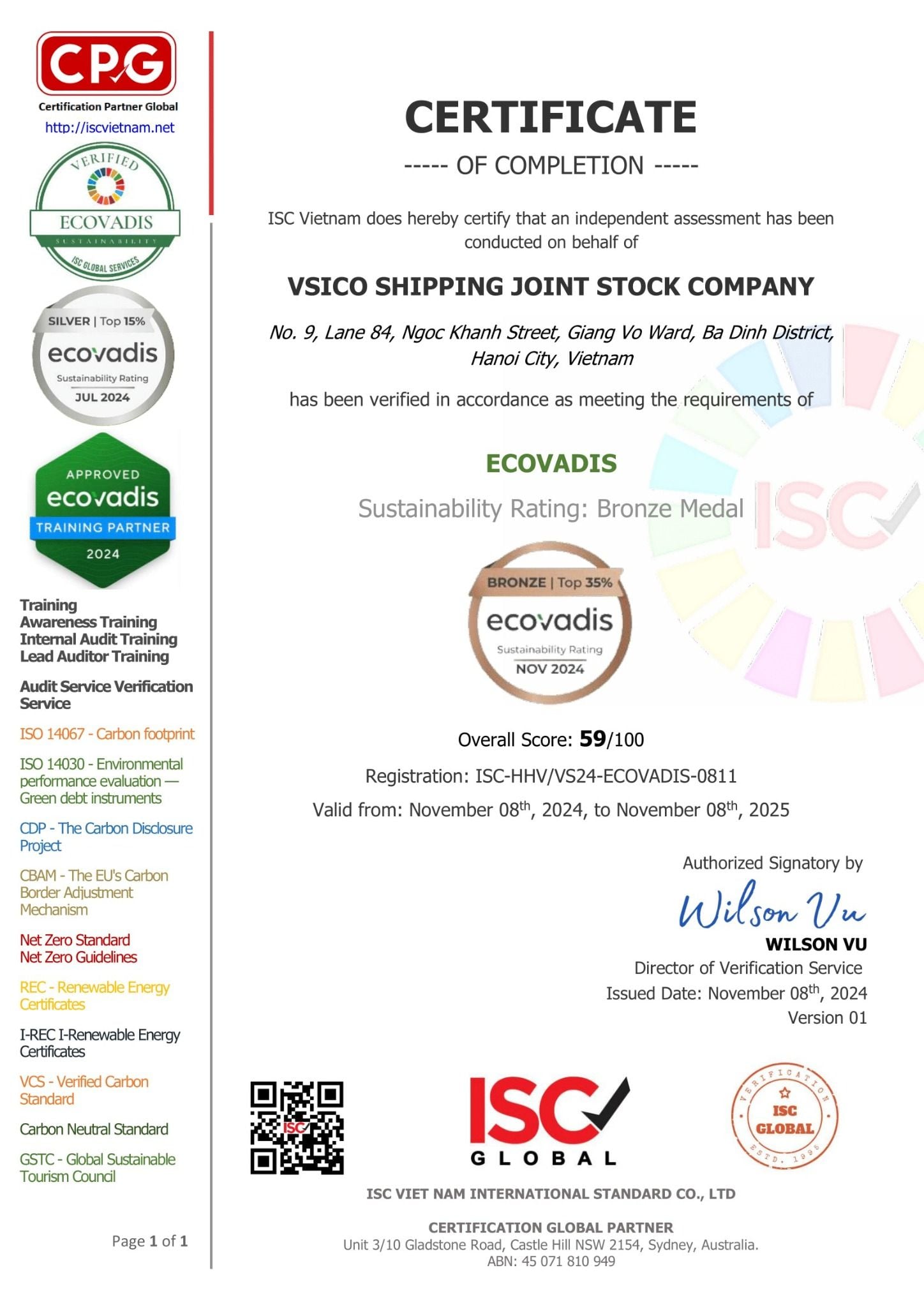 ISC Việt Nam tự hào là đơn vị tư vấn chứng nhận đầu tiên của Việt Nam đạt tiêu chuẩn phát triển bền vững hạng Silver Medal của EcoVadis. Hơn thế nữa, vào tháng 10 năm 2024, ISC Việt Nam đã chính thức trở thành đối tác đào tạo và tư vấn về phát triển bền vững của Hệ thống xếp hạng bền vững toàn cầu Ecovadis.